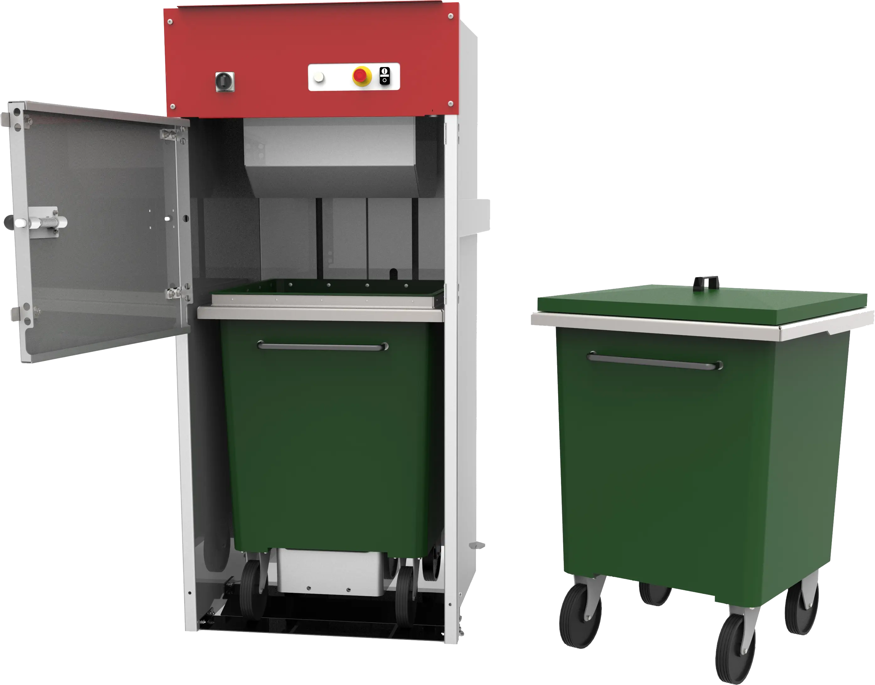 Indføring sker nemt gennem lugen, og komprimering finder sted. Når den er fuld, skiftes der til en ny beholder.